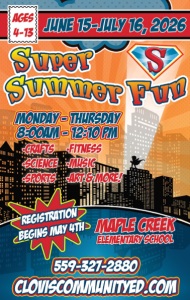 7 Registration Begins on Monday, May 4, 2026. You can register by going online: www.ClovisCommunityEd.com or coming to our office at Clovis Adult School (no phone registrations). By signing up for Summer Fun you are agreeing to our Terms and Conditions which can be found on our website. No Summer Fun on Thursday, July 2nd. Monday /Wednesday Tuesday/Thursday Rooms 8:00-10:00am 10:10am-12:10pm 8:00-10:00am 10:10am-12:10pm 18 Summer Fun Office K1 PRE-KINDERGARTEN FUN Ages 4-6 PRE-KINDERGARTEN FUN Ages 4-6 PRE-KINDERGARTEN FUN Ages 4-6 PRE-KINDERGARTEN FUN Ages 4-6 K2 SELF-CARE SUMMER Ages 6-9 SELF-CARE SUMMER Ages 10+ CRAFTY KIDS Ages 10+ CRAFTY KIDS Ages 6-9 1 BLING N’ THINGS! Ages 7-11 ARTS AND CRAFTS Ages 6-9 ARTS AND CRAFTS Ages 6-9 ALL THAT GLITTERS Ages 6-9 2 SCULPTURE Ages 10+ SCULPTURE Ages 6-9 WATERCOLOR AND DRAWING Ages 6-9 BOOK CLUB ART 10+ 3 STEMfinity & BEYOND Ages 6-9 STEMfinity & BEYOND Ages 10+ CREATIVE WRITING Ages 10+ INTERACTIVE GAMES Ages 10+ 4 KIDS CHEMISTRY AND PHYSICS Ages 10+ KIDS CHEMISTRY AND PHYSICS Ages 7-9 KIDS CHEMISTRY AND PHYSICS Ages 10+ KIDS CHEMISTRY AND PHYSICS Ages 7-9 5 PAINTING FUN Ages 6-9 MIXED MEDIA ART Ages 10+ MIXED MEDIA ART Ages 6-9 PAINTING FUN AGES 6-9 6 ARTS AND CRAFTS Ages 6-9 BOOKS BY YOUNG READERS Ages 6-9 BABYSITTING WORKSHOP Ages 10+ ARTS AND CRAFTS Ages 10+ 8 YOGA Ages 6-9 YOGA Ages 10+ 9 FAVORITE CARTOONS ARTS & CRAFTS Ages 6-9 DISNEY ARTS & CRAFTS Ages 6-9 FAIRY TALE ART Ages 6-9 BOOK ILLUSTRATION Ages 10+ 10 SEWING Ages 10+ SEWING Ages 6-9 FASHION DESIGN Ages 10+ DISNEY FUN Ages 6-9 12 MUSICAL THEATER Ages 6-9 MUSICAL THEATER Ages 10+ DRAMA Ages 8+ 13 ADVENTURE AT HOGWARTS Ages 9+ ADVENTURE AT HOGWARTS Ages 9+ NATURE EXPLORERS Ages 6-9 OCEAN EXPLORERS Ages 6-9 15 DINOSAURS, PALEONTOLOGY & FOSSILS Ages 9+ SPACE EXPLORATION Ages 9+ ALL THINGS STAR WARS! Ages 8+ AMERICAN SIGN LANGUAGE-WITH A TWIST! Ages 7+ 16 SUMMER FUN GARDENING Ages 8+ MATH FUN FOR 1ST & 2ND GRADERS Ages 6-9 PHOTOGRAPHY AND PRINTMAKING Ages 6-9 PHOTOGRAPHY AND PRINTMAKING Ages 10+ 17 IMPROV Ages 10+ DEBATE FUN Ages 10+ ADVENTURE AT HOGWARTS Ages 9+ MPR BADMINTON & PICKLEBALL Ages 8+ Sport Court SUMMER SPORTS CAMP Ages 10+ SUMMER SPORTS CAMP Ages 6-9 SUMMER SPORTS CAMP Ages 6-9 SUMMER SPORTS CAMP Ages 10+ BASEBALL Ages 8+